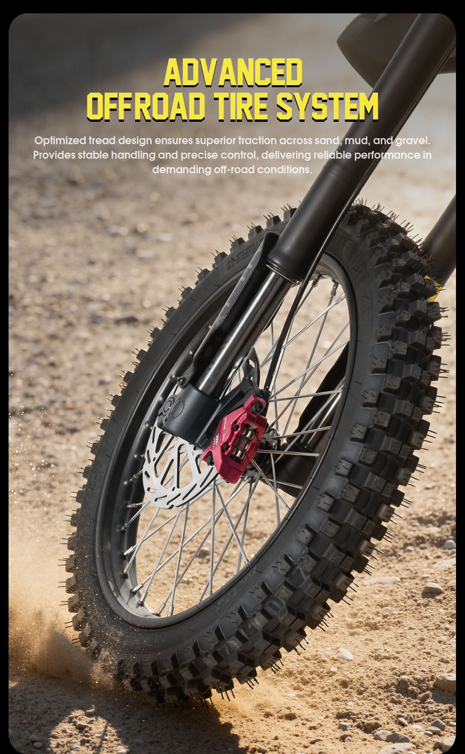 RICH BIT V9 Ultra komplektuojamas su bekelės tipo padangomis, pritaikytomis geresniam sukibimui ant smėlio, purvo ir žvyro. Toks protektorius padeda stabiliau valdyti motociklą ir užtikrina daugiau pasitikėjimo važiuojant sudėtingesniu reljefu. Šitas modelis akivaizdžiai labiau orientuotas į off-road naudojimą nei į įprastą miesto dangą.