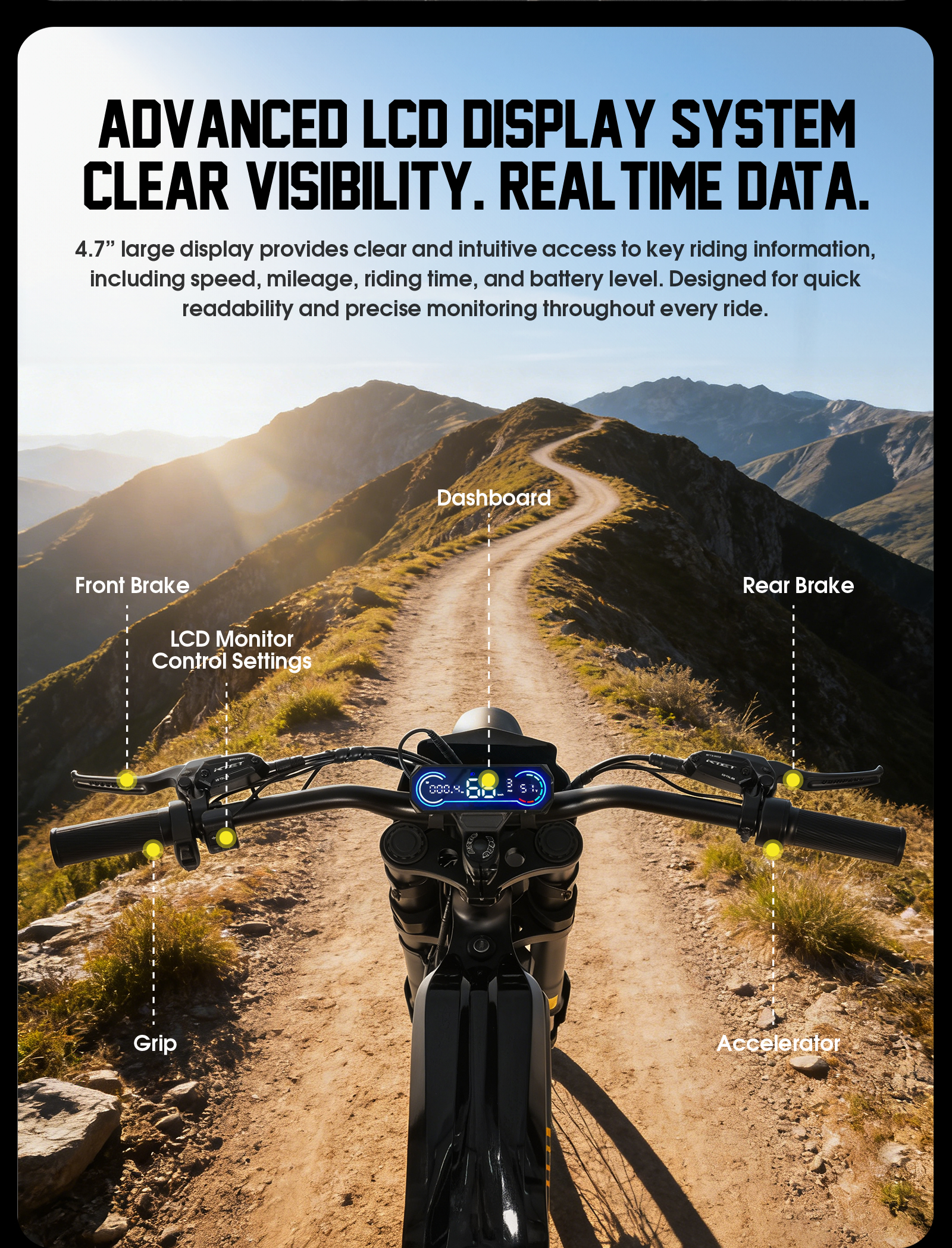 Motocikle įrengtas 4.7" colių LCD ekranas, kuriame aiškiai rodoma pagrindinė važiavimo informacija. Jame galima matyti greitį, ridą, važiavimo laiką ir baterijos lygį. Toks ekranas padeda patogiau stebėti svarbiausius duomenis visos kelionės metu.