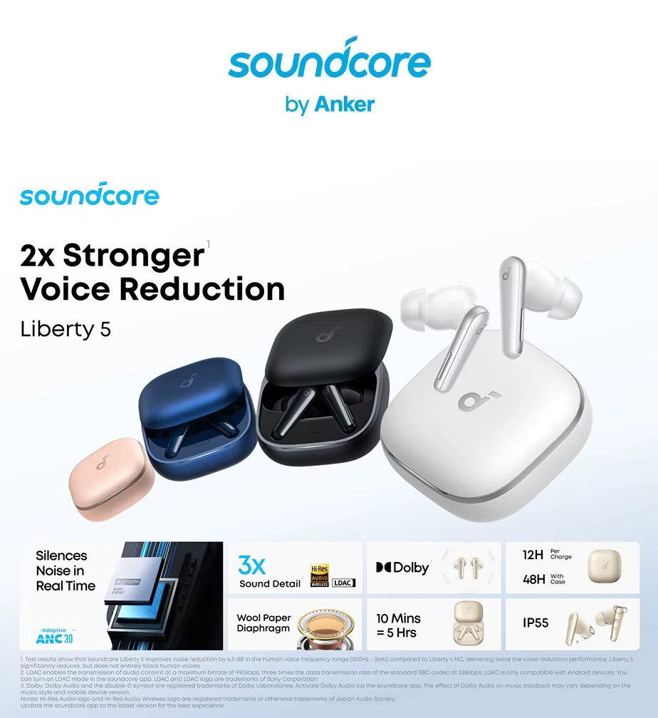 Soundcore – tai „Anker“ sukurtas garso technologijų prekės ženklas, kuris išsiskiria patikimais, pažangiais ir vartotojams draugiškais sprendimais. Jų ausinės garsėja puikiu kainos ir kokybės santykiu, moderniomis funkcijomis bei patogiu valdymu. Liberty serija – viena populiariausių šio gamintojo linijų, siūlanti aukštos klasės belaidžius ausinukus su galingu garsu, triukšmo slopinimu ir išmaniais nustatymais. Naujausias šios linijos modelis – Liberty 5, sukurtas dar labiau pagerinti klausymosi patirtį.