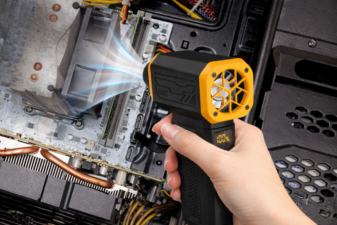 Viduje dirba bešepetėlis variklis iki 130000 RPM, todėl oro srautas jaučiasi pakankamai stiprus. Tokia galia praverčia, kai reikia išpūsti dulkes iš klaviatūros, automobilio tarpelių ar dirbtuvių kampų. Skirtingai nei suspaustas oras balionėlyje, čia turi tą pačią jėgą tol, kol yra baterijos. Tai praktiška, jei nori pastovaus rezultato.