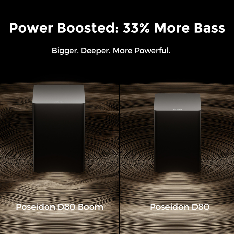 Poseidon D80 Boom turi galingą žemų dažnių garsiakalbį, kurio skersmuo siekia 6,5 colio (16,5 cm). Jo galios rodiklis leidžia išgauti gilų, sodrų bosą, kuris ne tik sustiprina muzikos ritmą, bet ir pagerina filmų garso efektus. Toks žemų dažnių atkūrimas suteikia tikroviškumo pojūtį ir pilną erdvinio garso patirtį.