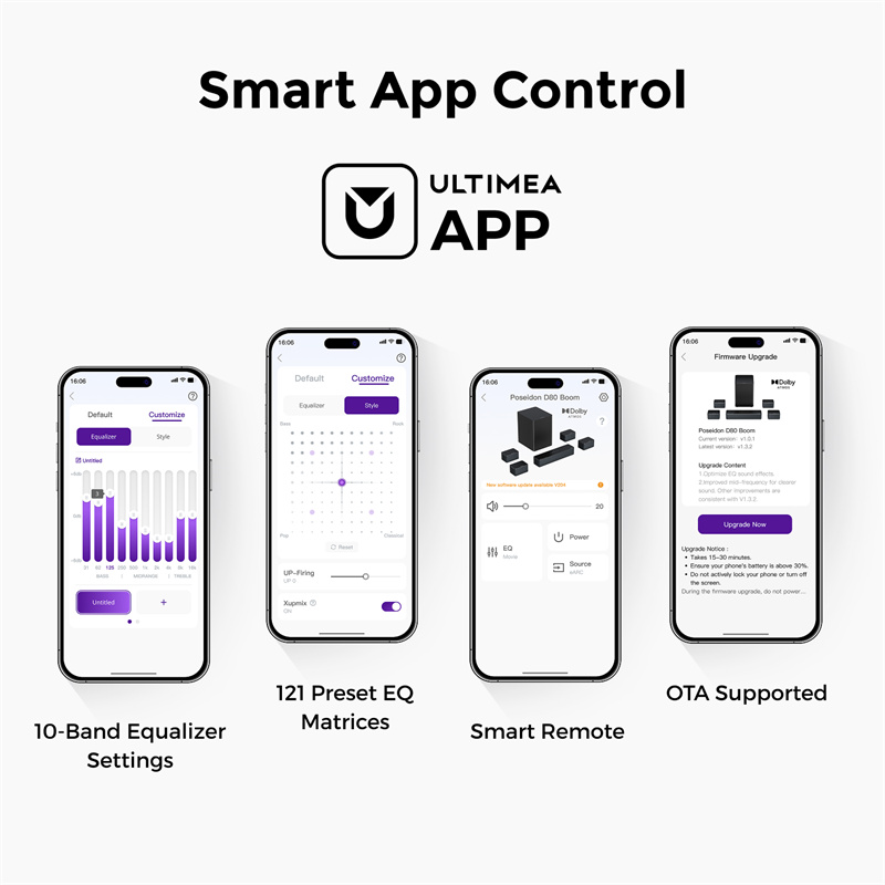 ULTIMEA Poseidon D80 Boom galima valdyti per išmaniąją programėlę, kurią galima įdiegti tiek iOS, tiek Android įrenginiuose. Per programėlę galima keisti garso režimus, nustatyti žemų ir aukštų dažnių balansą, įjungti erdvinio garso efektus ir net planuoti automatinį įrenginio įjungimą.