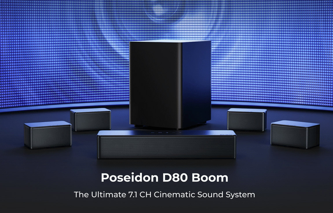 ULTIMEA Poseidon D80 Boom sukuria tikrą 360° garsą, kuris apgaubia visą patalpą. Įrenginys palaiko Dolby Atmos bei SurroundX technologijas, suteikiančias erdvinio garso efektus, kurie leidžia pajusti kiekvieną detalę. Tai ypač naudinga žiūrint filmus ar klausantis koncertų įrašų, kai garsas sklinda iš visų pusių.