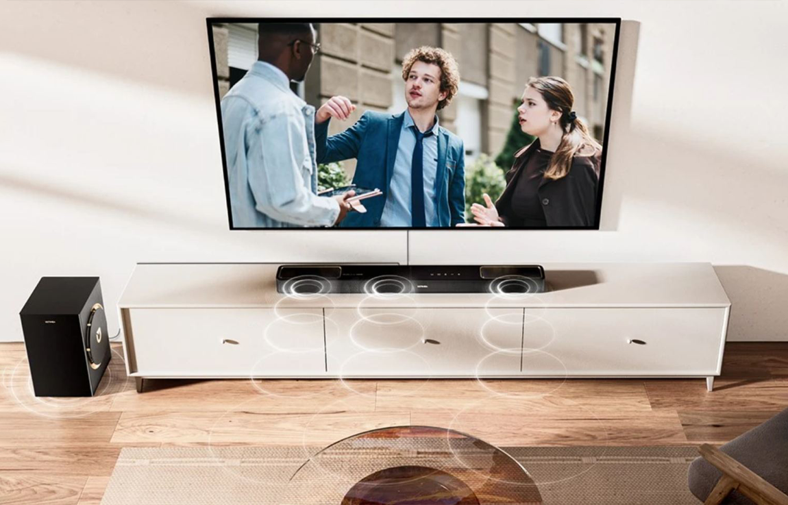 3.1.2 konfigūracija reiškia, kad sistema turi tris priekinio kanalo garsiakalbius, vieną žemų dažnių kanalą ir du vertikalius kanalus erdviniam garsui. Tokia struktūra leidžia tiksliai išgirsti net smulkiausius garso niuansus – šnabždesius, žingsnius ar lietaus garsus iš viršaus. Rezultatas – tikroviškas ir įtraukiantis garso laukas, kuris sukuria kino salės įspūdį jūsų svetainėje.