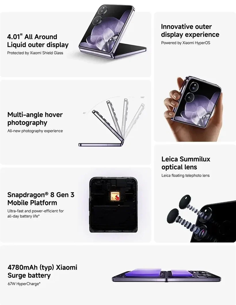 Viduje „sukasi“ Snapdragon 8 Gen 3, todėl telefonas greitas tiek kasdien, tiek žaidžiant ar filmuojant. Abu ekranai turi iki 120Hz atnaujinimą ir iki 3000 nits ryškumą, tad vaizdas sklandus ir ryškus. Baterija 4780mAh, o krovimas palaiko 67W, todėl kraunasi greitai ir patogiai.