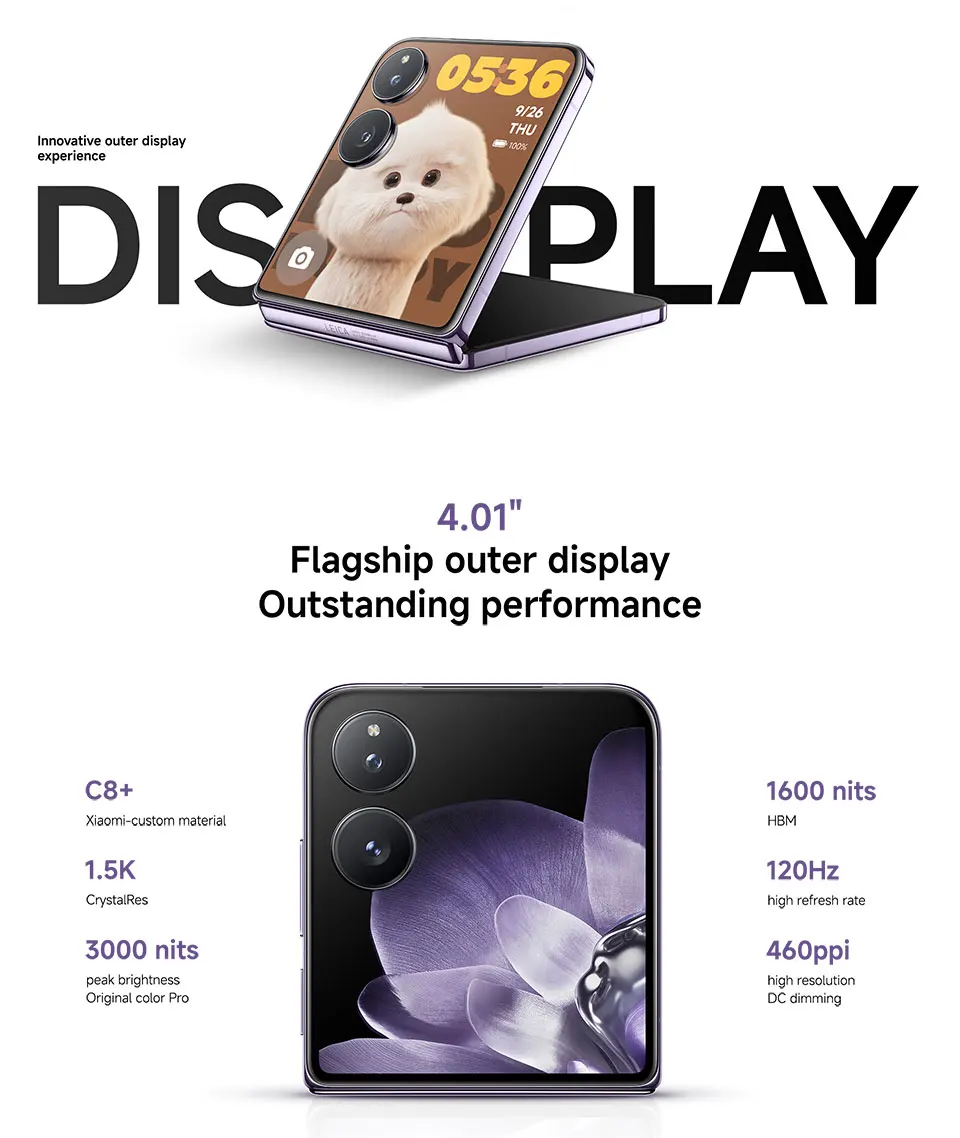 Atvertus telefoną gauni 6,86" AMOLED ekraną su 2912×1224 raiška ir 1–120Hz adaptyviu atnaujinimu. Iki 3000 nits ryškumas ir HDR palaikymas suteikia „premium“ vaizdą filmams, socialiniams ir darbui su tekstu. Dėl didelio ekrano patogu ir naršyti, ir redaguoti nuotraukas, ir rašyti ilgiau. Tai pilno dydžio flagmano patirtis, tik sulankstomame formate.