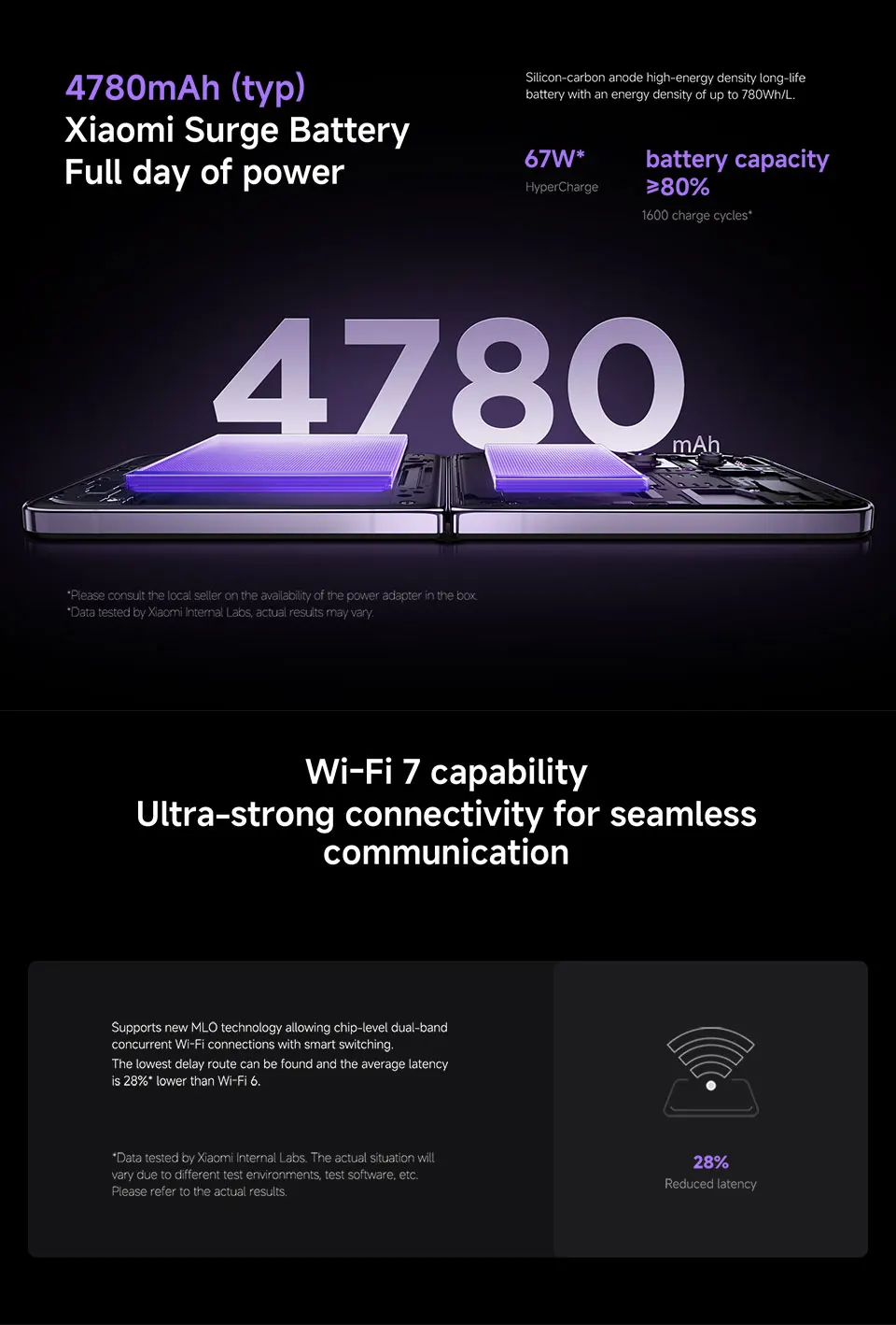 4780mAh baterija flip telefone yra rimtas skaičius, todėl kasdienai jos dažniausiai užtenka komfortiškai. 67W laidinis krovimas leidžia greitai pasikrauti. Wi-Fi 7 galimybė praverčia, jei namuose ar darbe turi naujesnį tinklą ir nori didesnio stabilumo bei greičio.