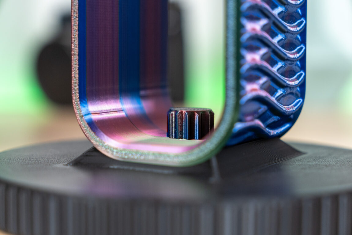 С PETG-GF ситуация иная. Хотя сопло стальное, оно засорилось во время нанесения первых слоев. К счастью, сработала система обнаружения неисправности, и печать автоматически остановилась. При более внимательном рассмотрении выяснилось, что для этого пластика рекомендуется использовать сопло из закаленной стали диаметром не менее 0,6 мм. Однако это ошибка пользователя, а не самого принтера.