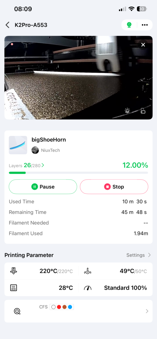 Я также провел тест на скорость потока, и наилучшие результаты были достигнуты при заводских настройках, то есть без каких-либо изменений. K2 Pro имеет автоматическую калибровку потока с помощью камеры в печатающей головке — принтер сам проверяет экструдированный пластик перед началом работы.