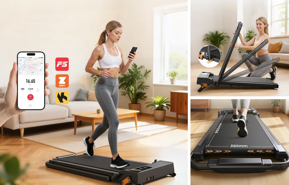 Беговая дорожка имеет размеры 380 × 950 мм, поэтому шаг ощущается стабильным даже при увеличении темпа. Ширина 380 мм идеально подходит для повседневной ходьбы под столом или для более спокойного бега, когда вам не нужны большие кроссовки. Длина 950 мм обеспечивает комфортное движение, а беговая дорожка сохраняет компактность формата беговой площадки.