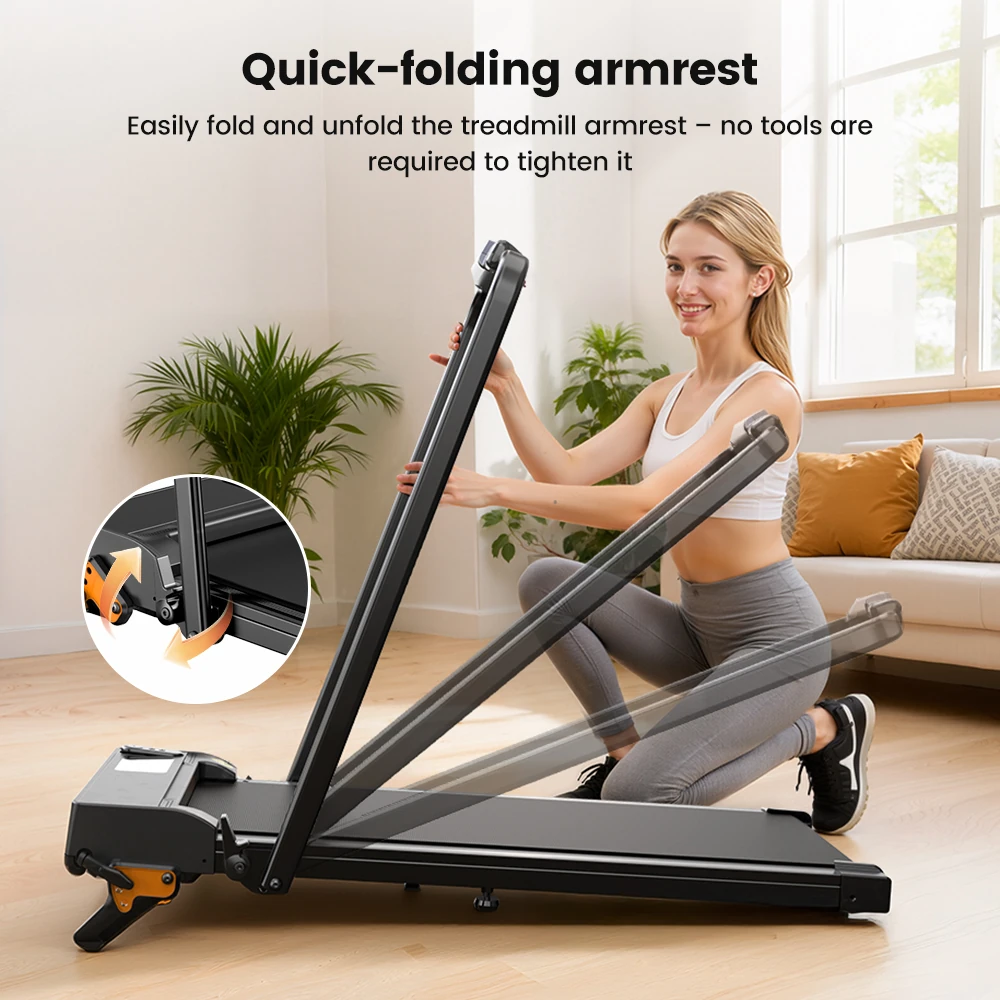 В комплект входит беспроводной пульт дистанционного управления, позволяющий быстро запускать, останавливать и регулировать скорость. Это особенно удобно, если вы используете беговую дорожку под столом и хотите управлять ею, не отвлекаясь от работы. Элементы управления интуитивно понятны, поэтому вы привыкнете к ним за несколько минут.