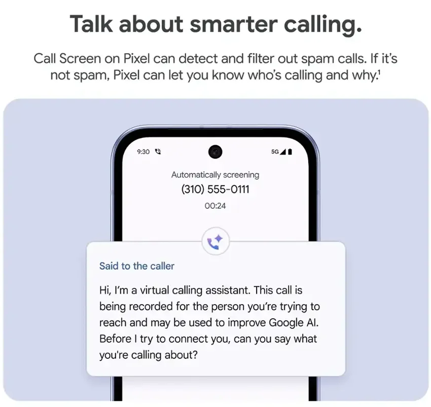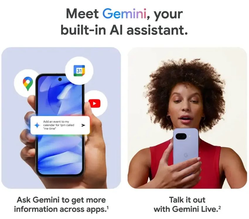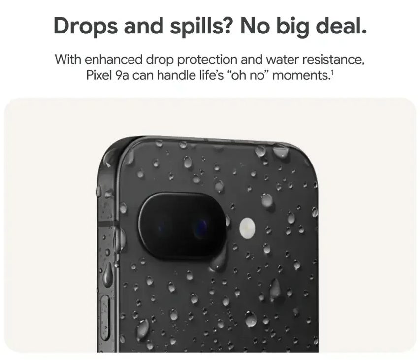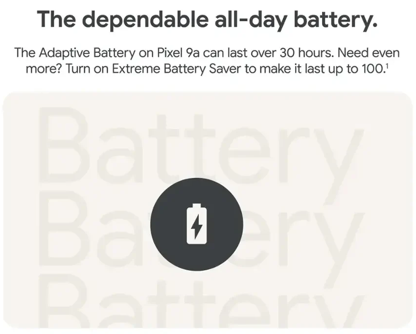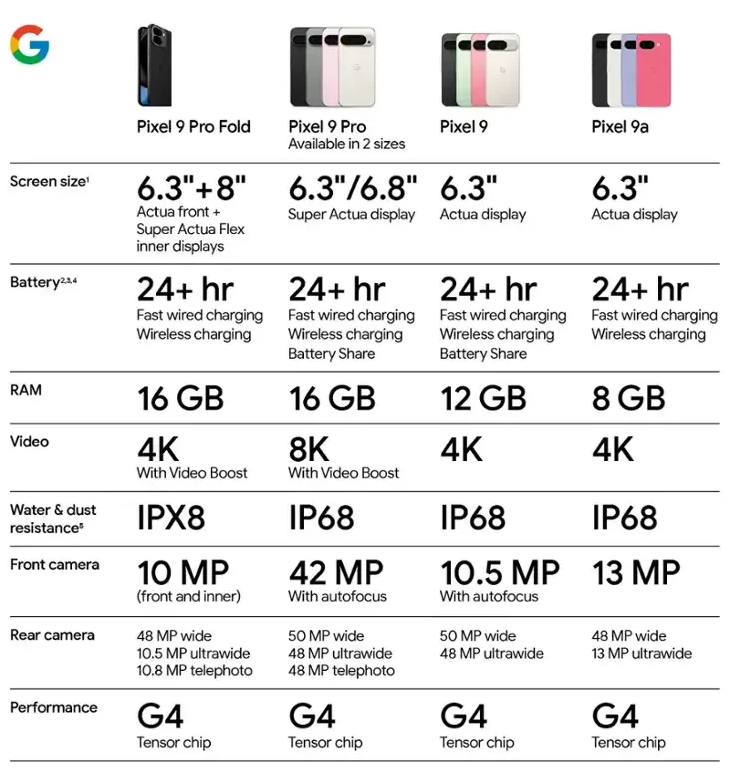 Основные характеристики телефона Pixel 9a: 6,3-дюймовый дисплей Actua P-OLED с частотой обновления 120 Гц и максимальной яркостью 2700 нит, процессор Google Tensor 4, 48-мегапиксельная основная и 13-мегапиксельная сверхширокоугольная камеры с функциями ИИ, 8+128 ГБ или 8+256 ГБ памяти, аккумулятор емкостью 5100 мАч, 7 лет обновлений Android, водонепроницаемость IP68.