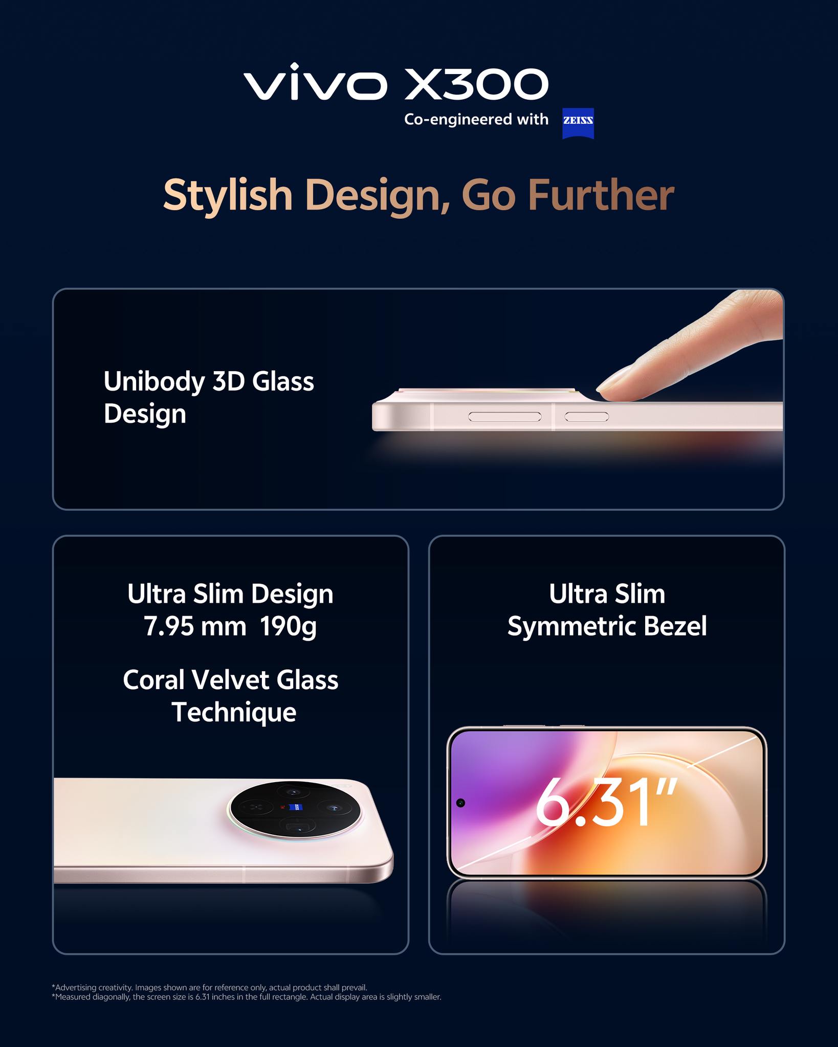 VIVO X300 разработан для комфортного повседневного использования, даже с высококачественным дисплеем. Вес около 190 г и тонкий корпус позволяют удобно держать телефон в руке и использовать его одной рукой без дискомфорта. 6,31-дюймовый AMOLED-дисплей с частотой обновления 120 Гц обеспечивает плавное изображение при просмотре веб-страниц, чтении или просмотре видео. Тонкие рамки экрана помогают сохранить компактные размеры телефона и современный внешний вид.