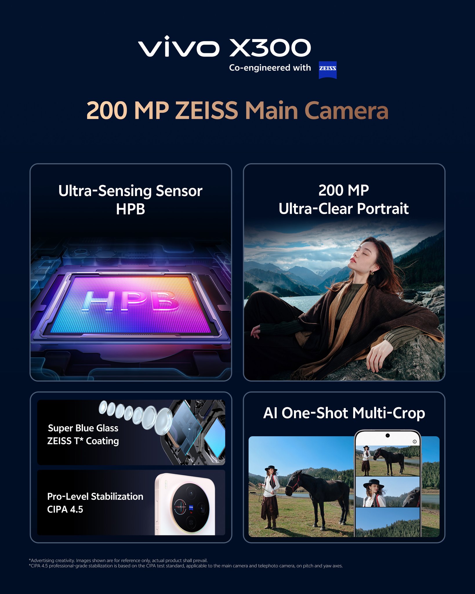 VIVO X300 оснащен 200-мегапиксельной основной камерой для детальной и универсальной мобильной фотосъемки. Сенсор высокого разрешения позволяет делать четкие снимки, кадрировать изображения без потери деталей и снимать лучше в сложных условиях освещения. Система камер дополнена 50-мегапиксельной телеобъективной и 50-мегапиксельной сверхширокоугольной камерами, что обеспечивает большую гибкость в повседневных ситуациях. Телефон также поддерживает расширенные режимы HDR и ночной съемки.